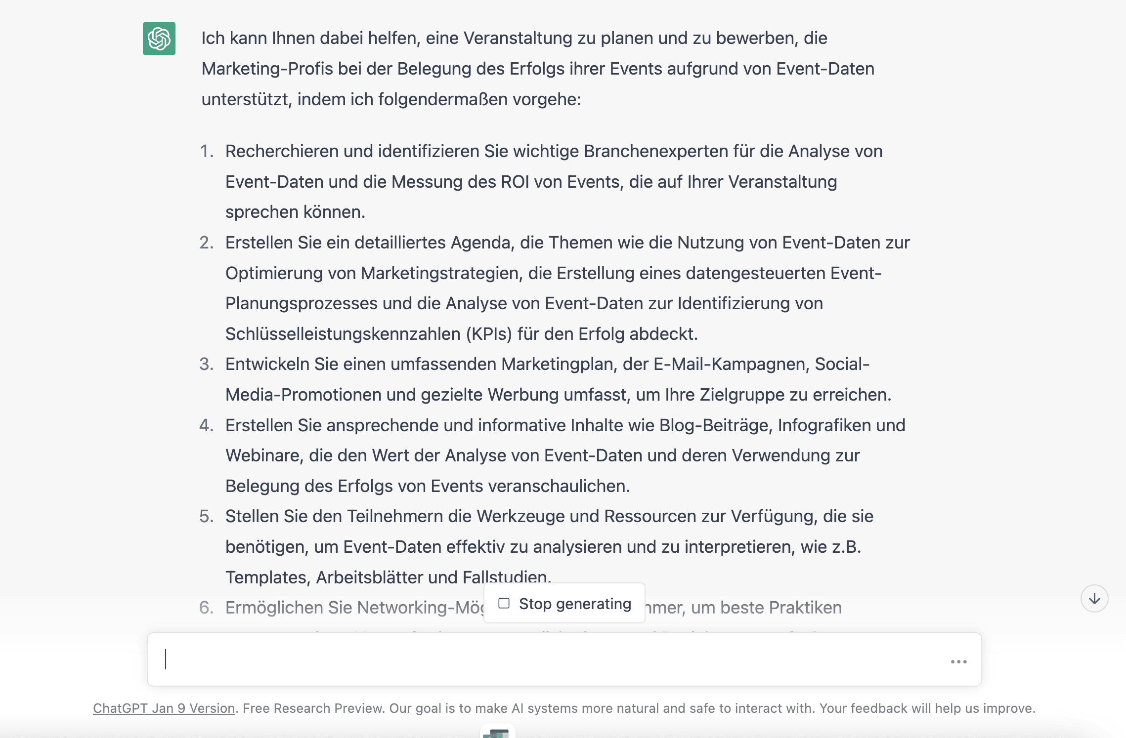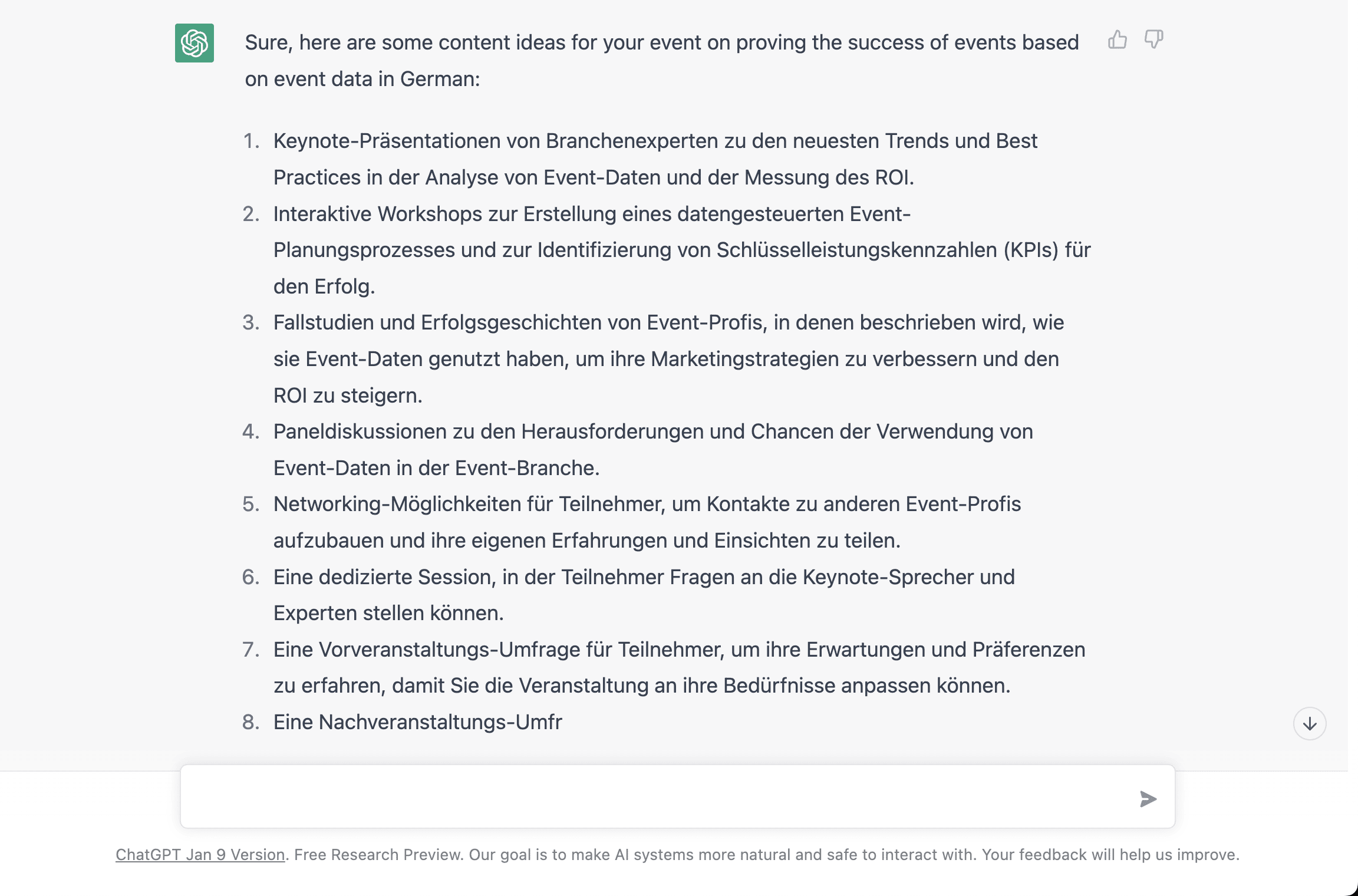 Allerdings ist es zeitaufwändig und kräftezehrend, tonnenweise Posts in den sozialen Medien zu verfassen und sich gleichzeitig auf das Erlebnis der Teilnehmer*innen zu konzentrieren. Genau hier kommt ChatGPT ins Spiel.