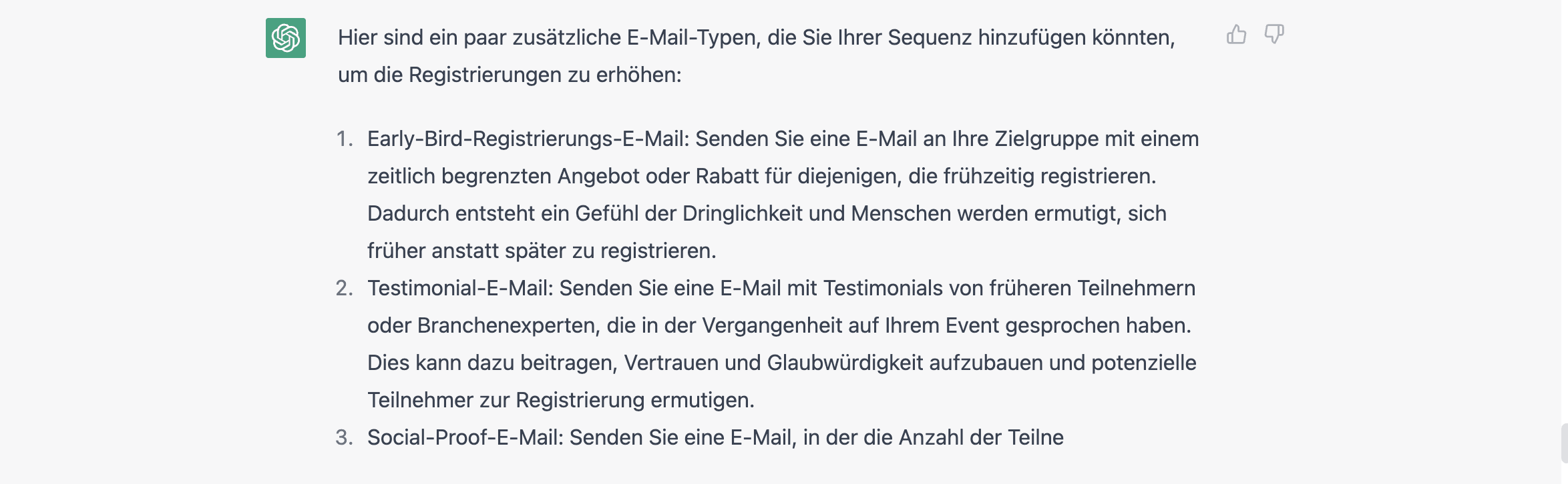 Der Bot wird eine E-Mail schreiben, die du in wenigen Minuten nach deinen Wünschen anpassen kannst. Du kannst ChatGPT auch für E-Mail-Marketingkampagnen nutzen, z. B. für E-Mails mit der letzten Chance, sich anzumelden, oder für E-Mails mit Frühbucherpreisen.