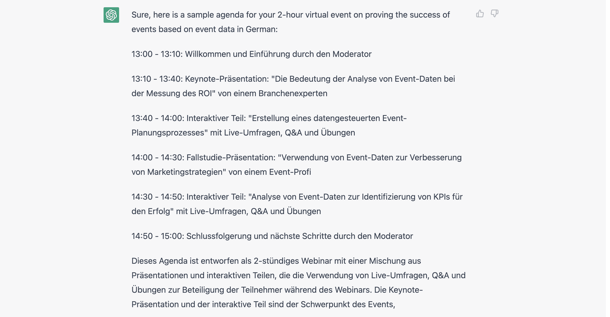 Und das ist die Antwort, die wir bekommen haben: Klar, hier ist ein Beispiel für eine Agenda für deine 2-stündige virtuelle Veranstaltung zum Thema "Erfolg von Veranstaltungen anhand von Veranstaltungsdaten nachweisen":