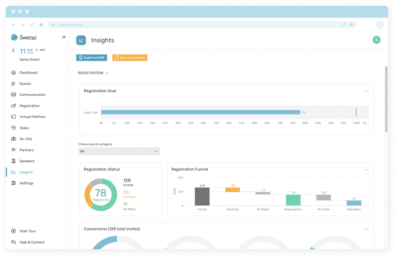 Glücklicherweise muss man kein vierjähriges Universitätsstudium absolvieren, um im Jahr 2025 datenkompetent zu sein. Die heutigen Datentools machen die Analyse und Optimierung von Veranstaltungen für alle zugänglich, die über ein Grundverständnis verfügen. Sie stellen deine Daten in leicht verständlichen Diagrammen dar, zeigen automatisch auf, wenn du hinter dem Plan zurückbleibst und machen in Echtzeit Vorschläge, wie du das Problem beheben kannst.