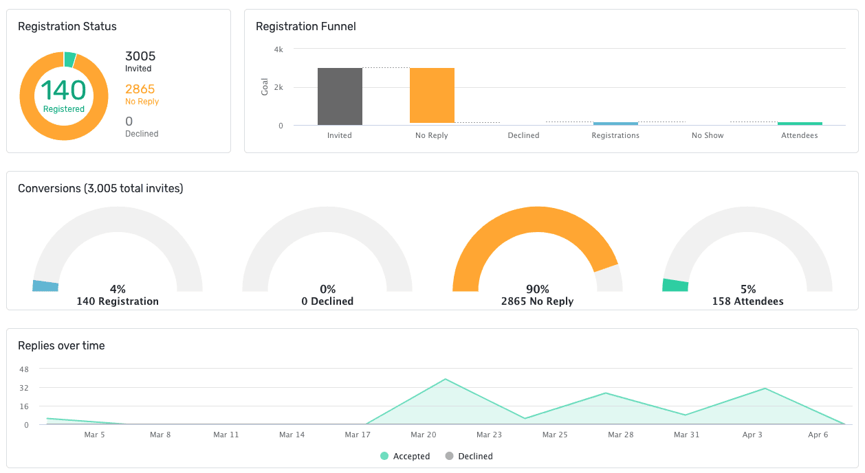Dank der Datenanalyse haben Event-Marketer*innen mehr Informationen über ihre Zielgruppe als je zuvor. Nutze die Technologie, um diese Informationen für die Erstellung von Leistungskennzahlen (Key Performance Indicators, KPIs) zu nutzen und den Fortschritt deiner Event-Marketing-Kampagnen effektiv zu verfolgen. Der Einsatz eines Event-Marketing-Tools, das den Erfolg dieser Veranstaltungen anhand von Daten aufzeigen kann, ist von entscheidender Bedeutung.