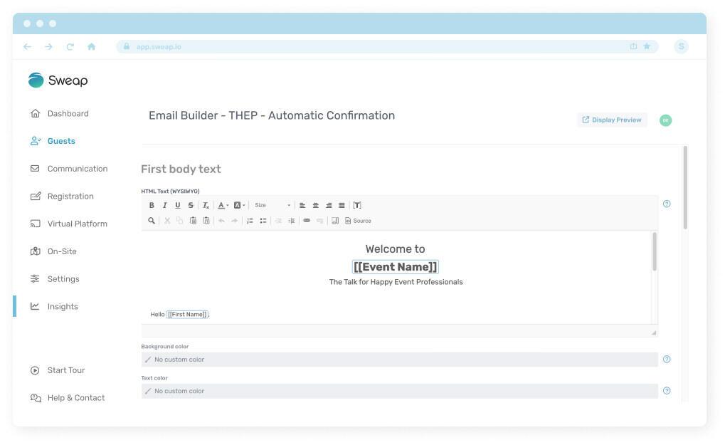 Das Tool zur effektiven Event-Kommunikation von Sweap ist in dieser Phase sehr nützlich, um die Aufmerksamkeit deiner Zielgruppe zu wecken und durch automatisierte und personalisierte E-Mail-Kampagnen Anmeldungen zu fördern.