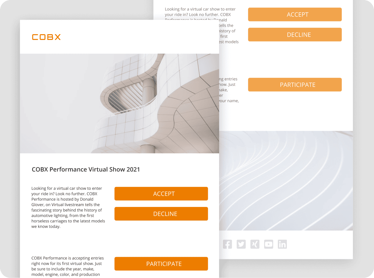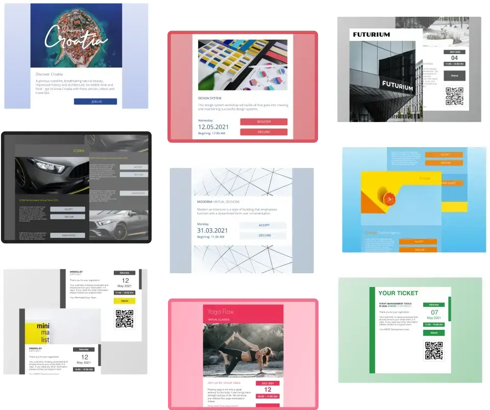 Wähle aus einer Reihe schöner Vorlagen, um deine Veranstaltungskommunikation auf ein neues Level zu heben. Alle deine Assets können an deine Unternehmensmarke angepasst werden. Unsere Seiten und E-Mails sind für hohe Konversionsraten ausgelegt.