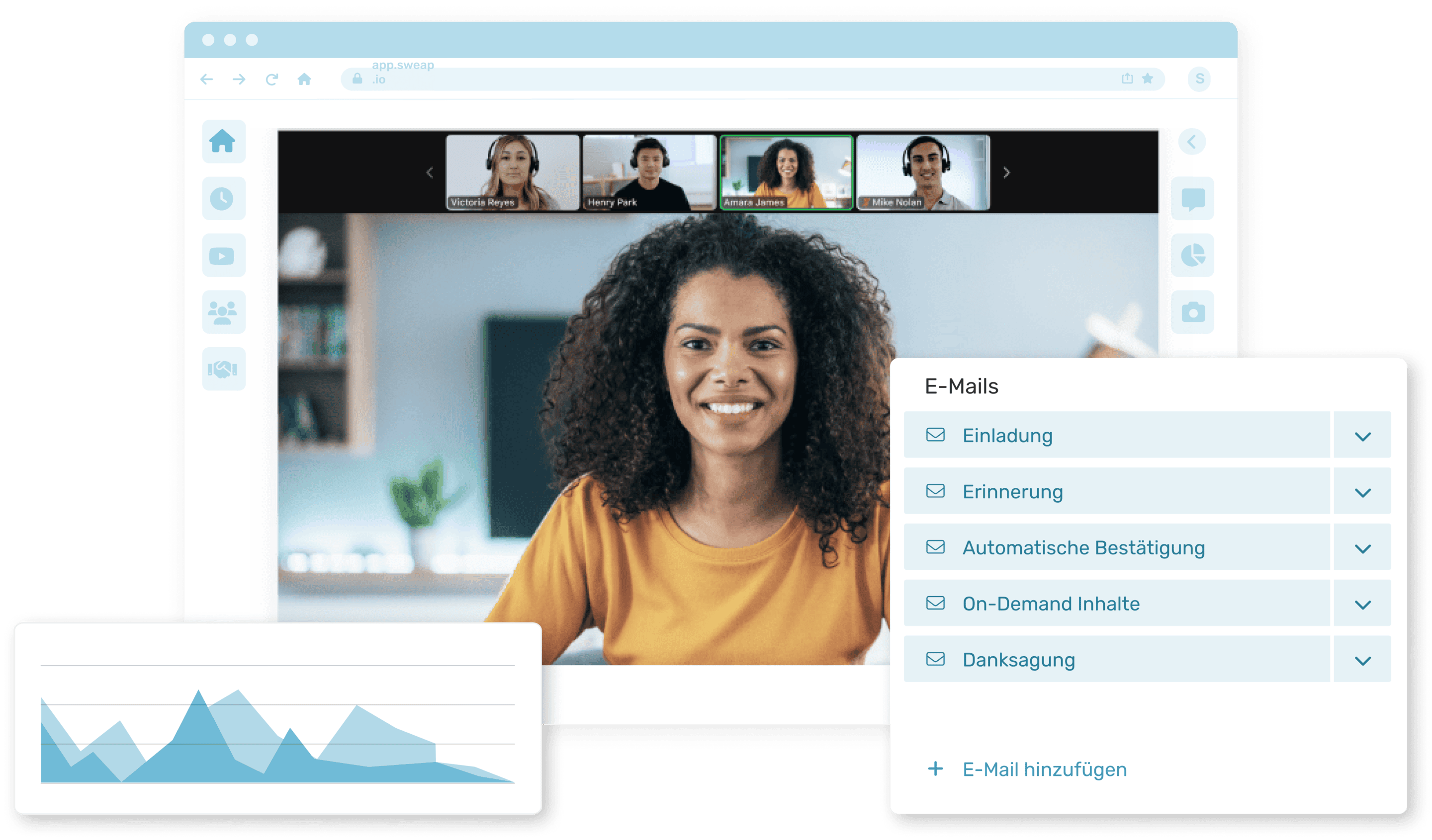 Die Plattform macht Prozesse wie E-Mail-Marketing, Gästemanagement und Veranstaltungsregistrierung effizienter. Sweap funktioniert für hybride, persönliche und virtuelle Veranstaltungen. Außerdem erhältst du detaillierte Berichte, die dir helfen, dein Veranstaltungsprogramm zu verbessern.