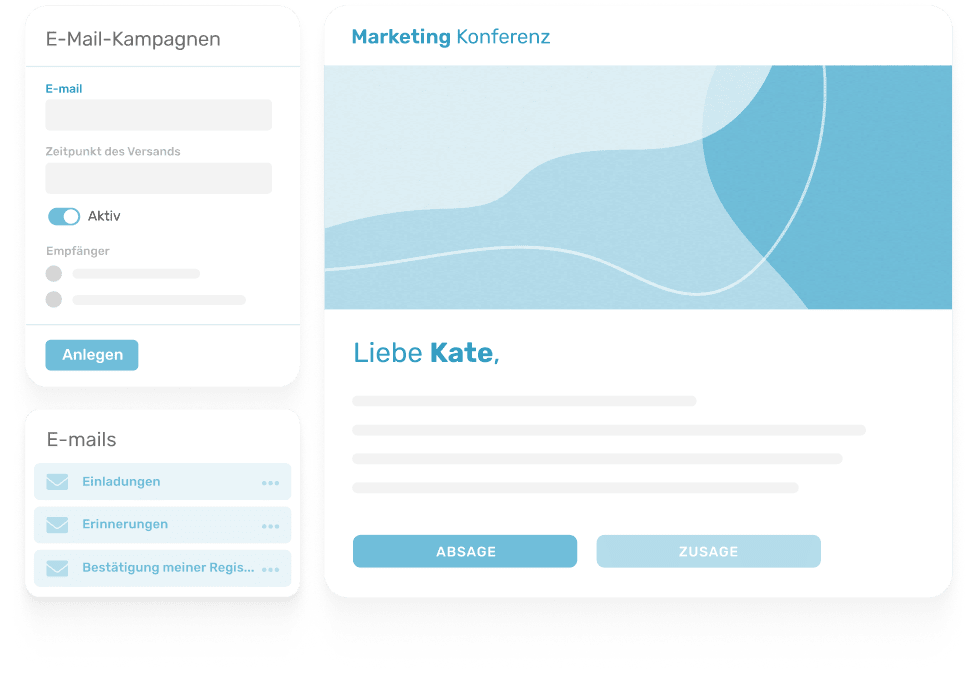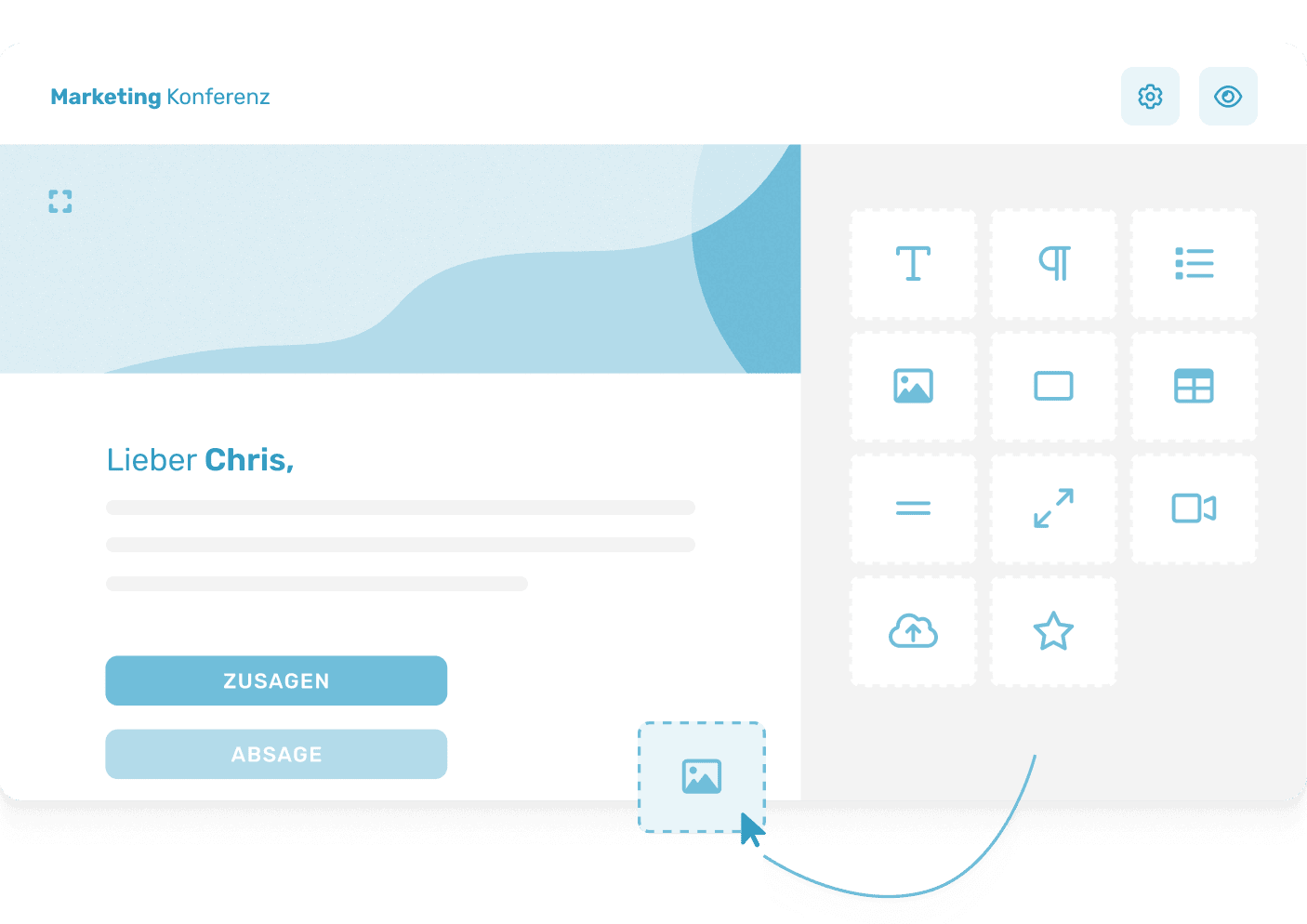 Baue in wenigen Minuten vollständig angepasste Event-E-Mails – ganz ohne technische Hürden. Ziehe deine Design- Elemente per Drag-and-Drop in den Editor und erstelle Event-Kommunikation, die konvertiert.