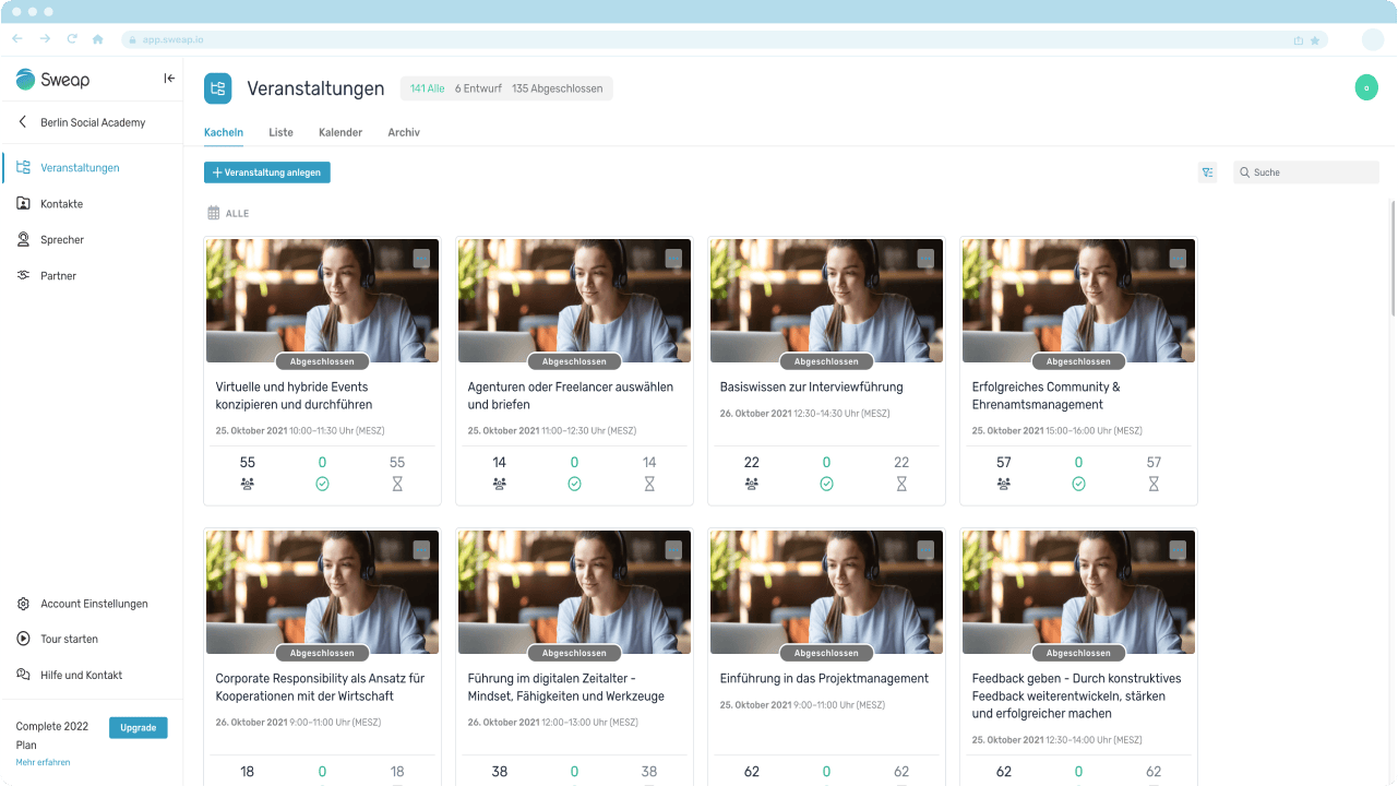 Dank Sweap kann die Berlin Social Academy mehrere gleichzeitige Events effizient durchführen. Die einfache Integration von Links für virtuelle Events und die Echtzeit-Übersicht über den Status jedes Events ermöglichen eine reibungslose Event-Koordination. Sweap ermöglichte es der Berlin Social Academy, den Überblick über den Status aller 50 Events in Echtzeit zu behalten, von der Anmeldung bis zur Nachbearbeitung.