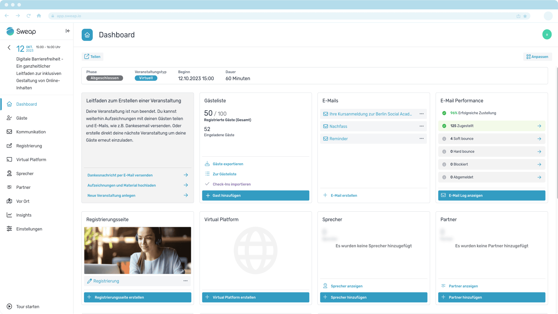 Durch die Nutzung von Sweap gelang es, sowohl virtuelle als auch physische Events mit Leichtigkeit zu koordinieren. Die Plattform ermöglichte eine flexible Handhabung der Veranstaltungsformate, indem für virtuelle Events einfache Link-Einbindungen und für Vor-Ort-Events detaillierte Teilnehmerinformationen bereitgestellt wurden. Diese Flexibilität erleichterte die Anpassung an die Bedürfnisse der Teilnehmenden und Referenten und förderte eine hohe Teilnahme- und Zufriedenheitsrate.