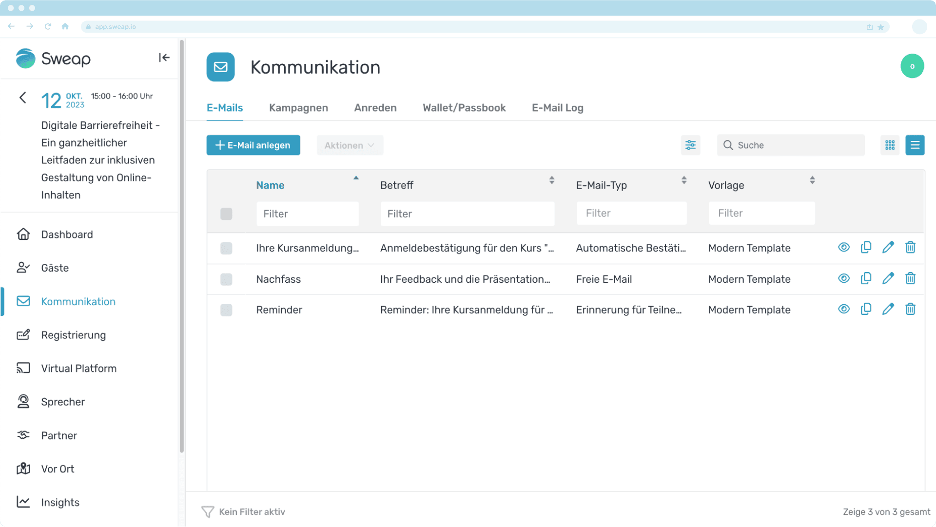Sweap bietet die Möglichkeit, in Echtzeit den Status jedes einzelnen Events zu überwachen. Diese Funktion erwies sich als unverzichtbar für die schnelle Anpassung an unerwartete Änderungen und die effektive Kommunikation mit Referenten und Teilnehmenden. Die Transparenz und Kontrolle, die durch die Live-Daten gewährleistet wurden, trugen maßgeblich dazu bei, die Komplexität der Event-Woche zu managen.