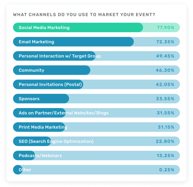 Social media marketing is the most used event marketing channel, followed by email marketing and personal invites (Sweap).